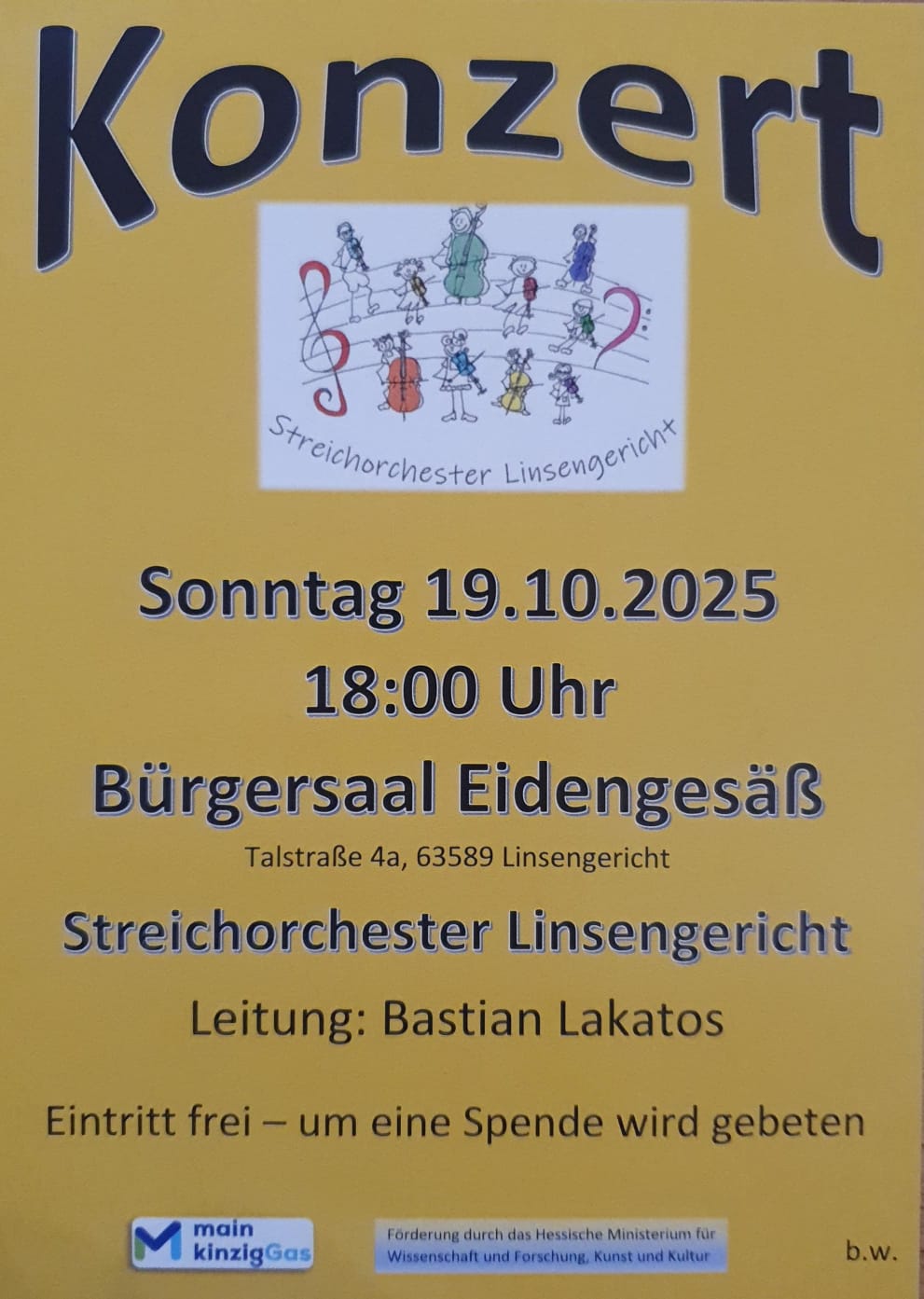 Am Sonntag, 19.10.2025, um 18 Uhr gibt das Streichorchester Linsengericht ein Konzert im Bürgersaal Eidengsäß (Talstraße 4a, 63589 Linsengericht). Alle sind herzlich eingeladen! Der Eintritt ist frei, es wird jedoch um Spenden gebeten.